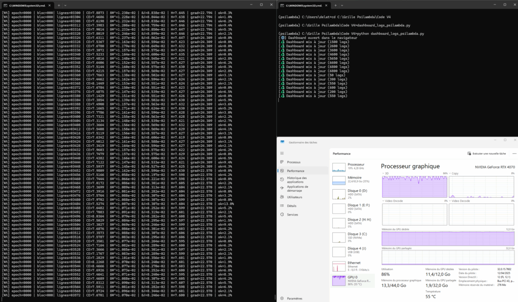 Meanwhile, my ΨΛ (Psi-Lambda) project runs on a single RTX 4070 — crunching logical-physical systems and hybrid spiking networks, tracking δΨ² and δ𝒮 metrics in real time.