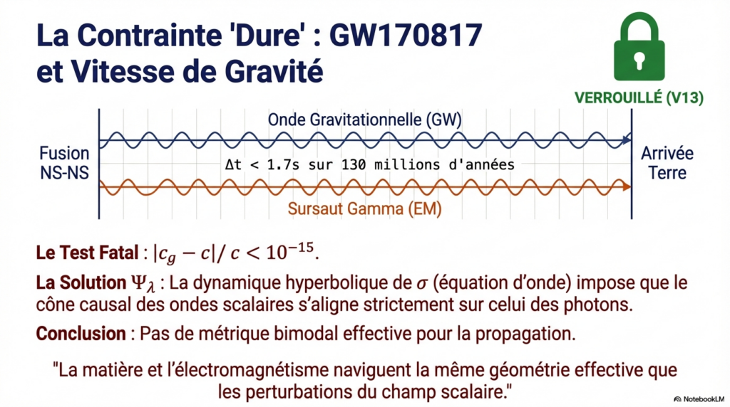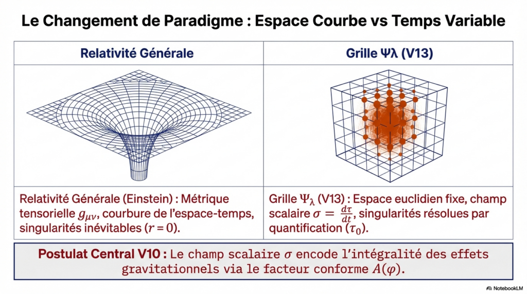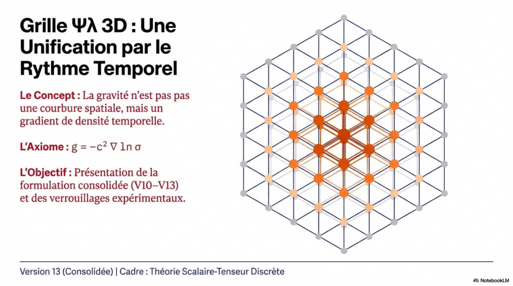 The central postulate of Ψλ theory (Sources V10, V11) overturns the classical geometric interpretation. Gravity (g) is nothing more than the macroscopic manifestation of a local variation in the rate of proper time. What we perceive as attraction is in fact the expression of a scalar field φ, which is nothing other than the effective continuous avatar of a synchronization defect on the discrete grid.